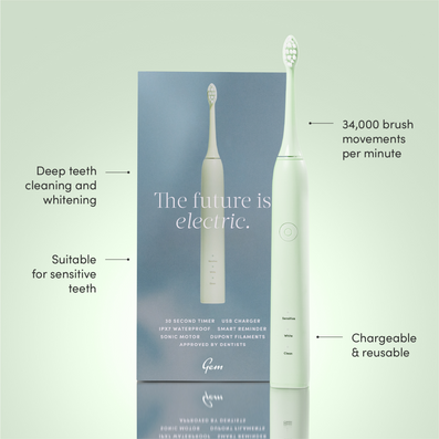 Gem Electric Toothbrush Mint is a sleek electric toothbrush which provides the perfect clean. Designed for every brushing need, it features three precision cleaning modes, ideal for sensitive teeth, deep cleaning and whitening. With 34,200 brush movements per minute, it delivers superior plaque removal while pulsing fluid between teeth and along the gumline for a thorough, dentist-fresh feel.