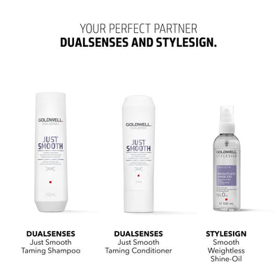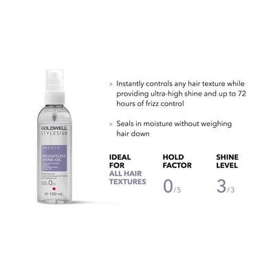 Goldwell StyleSign Smooth Weightless Shine-Oil (100ml) has been formulated for use on all hair textures, providing ultra-high shine with no styling hold factor. Sealing in moisture without weighing the hair down, it instantly controls any hair texture while providing up to 72 hours of frizz control. In addition, it effectively enhances colour luminosity and shine.