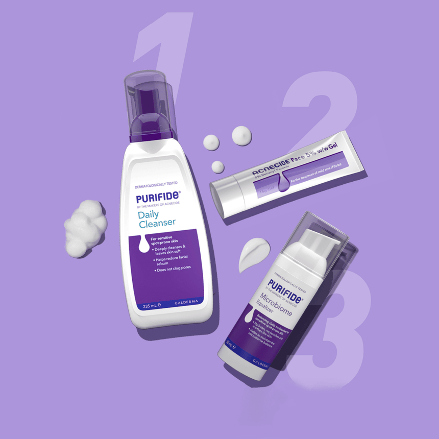 Acnecide + Purefide is a dermatologist-developed skincare system for acne-prone skin. Acnecide targets breakouts with clinically proven benzoyl peroxide, while Purefide offers gentle, non-comedogenic care to soothe and support the skin. Together, they provide a complete routine to treat spots and maintain a healthy, balanced complexion.