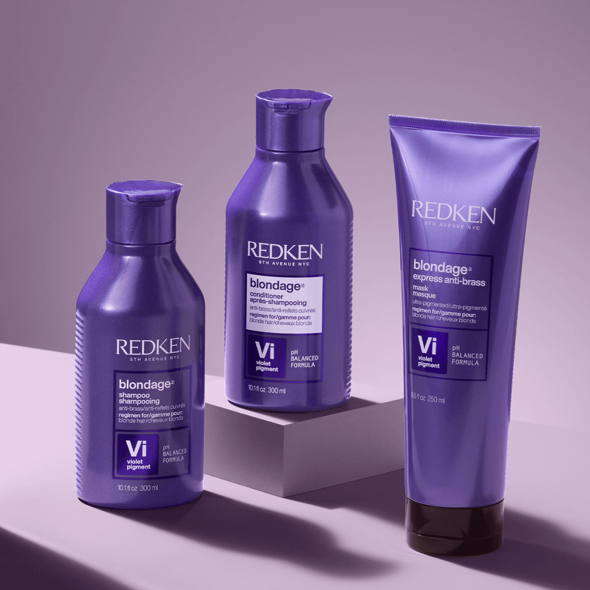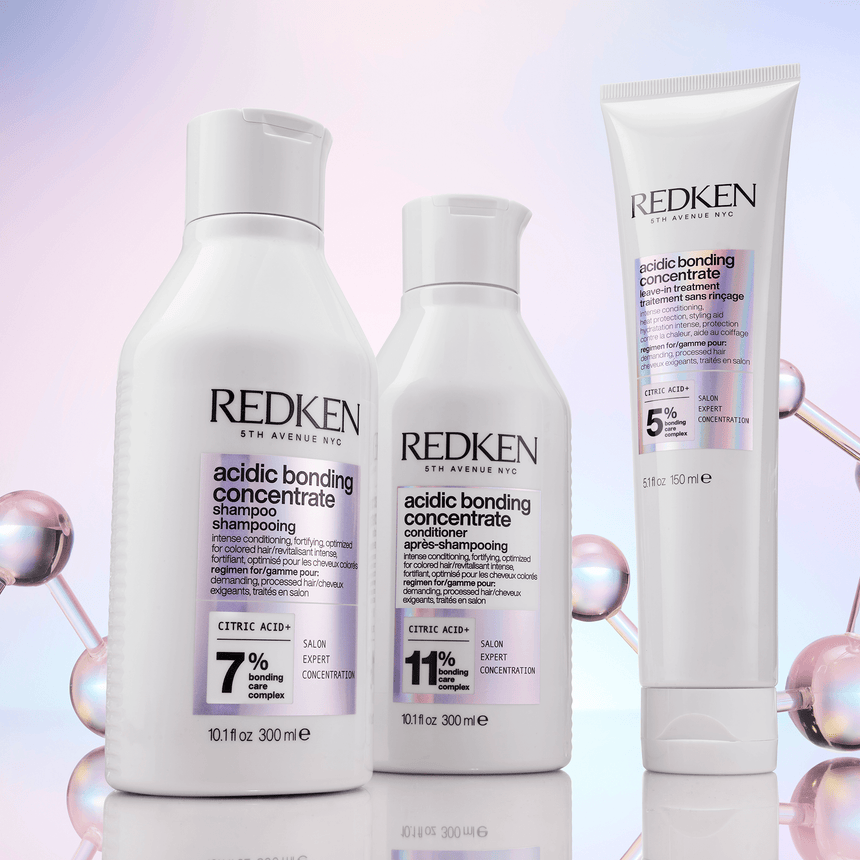 For blonde or highlighted hair, the Redken Colour Extend Blondage Shampoo is a purple formula that neutralises brassiness. The Redken Acidic Bonding Concentrate Shampoo and Conditioner repair and strengthen colour-treated hair, offering protection against future damage. These products work together to maintain colour brilliance, enhance shine, and provide extra care for chemically treated hair.