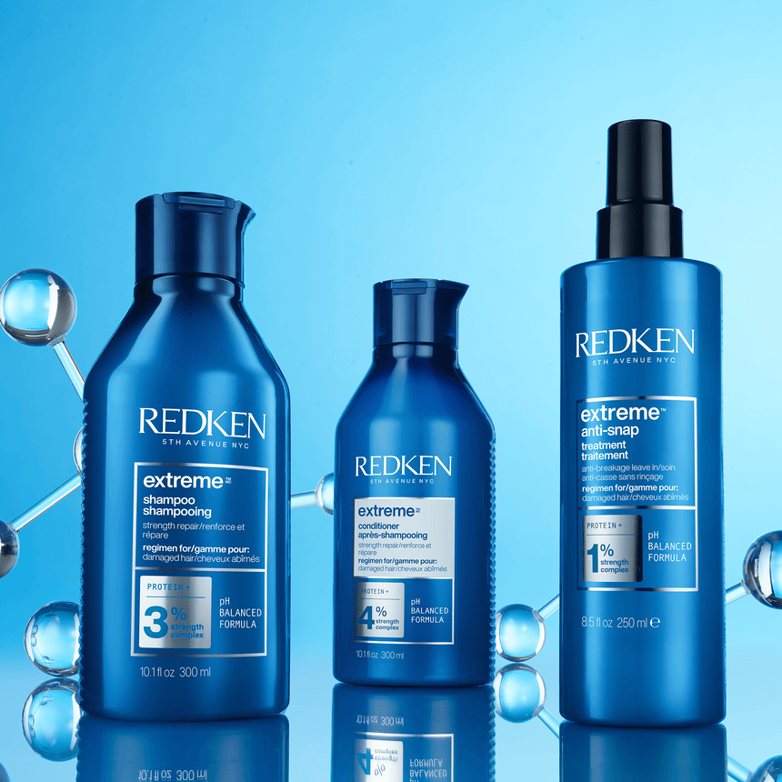 Redken Extreme Strength Shampoo strengthens and repairs damaged hair, helping to reduce breakage. The Redken Extreme Strength Conditioner detangles and fortifies the hair, making it more resilient. For further protection, the Redken Extreme Anti-Snap Treatment targets and prevents additional breakage. Lastly, the Redken Acidic Bonding Concentrate Shampoo and Conditioner are specifically designed to repair and strengthen severely damaged, colour-treated hair by balancing its pH levels.