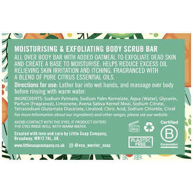 Little Soap Company Eco Warrior Moisturising & Exfoliating Body Scrub Bar (100g) is a cleansing, moisturising and exfoliating bar which has been fragranced with citrus essential oils and formulated with Oatmeal to help clear and exfoliate the skin of the body, revealing an exceptionally smooth appearance.