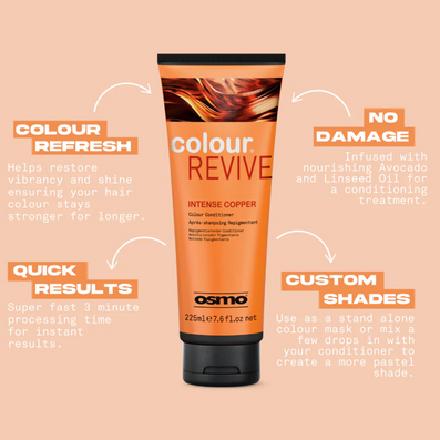 Osmo Colour Revive Intense Copper (225ml) is an intense colour conditioning treatment that maintains & enhances colour vibrancy. The frequent use of most shampoos, exposure to the sun and other external factors accelerates the loss of colour intensity. This product rectifies that, by offering instant, luminous colour.
