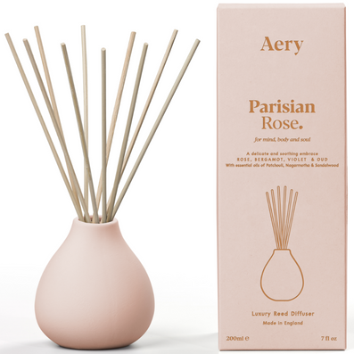 Aery Parisian Rose Reed Diffuser (200ml) releases a timeless, romantic fragrance inspired by the charm of boutique hotels and alfresco evenings in the heart of Paris. With fresh Bergamot opening into a delicate blend of Rose and Jasmine, the scent deepens into a rich base of Oudh, Cedar and Violet, capturing the elegance of a blooming Parisian bouquet. Glamorous yet understated, Parisian Rose brings a soft, sophisticated ambience to bedrooms, dressing areas or any space where classic floral beauty is desired.