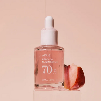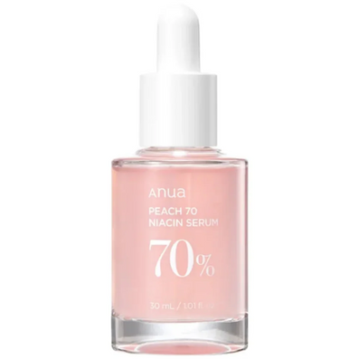 Anua Peach 70 Niacinamide Serum (30ml) is a glow booster serum to help improve the appearance of uneven, dull skin and enhance radiance. The quickly-absorbed, lightweight, non-greasy formula is enriched with Peach Yogurt Complex to remove dead skin cells and unclog pores. Peachnia gently exfoliates dead skin cells and helps with uneven skin tone. 5% Niacinamide helps to brighten a dull complexion. A combination of three types of Vitamin B12 and Triple Hyaluronic Acid deeply moisturises and hydrates, generating a naturally pink complexion.