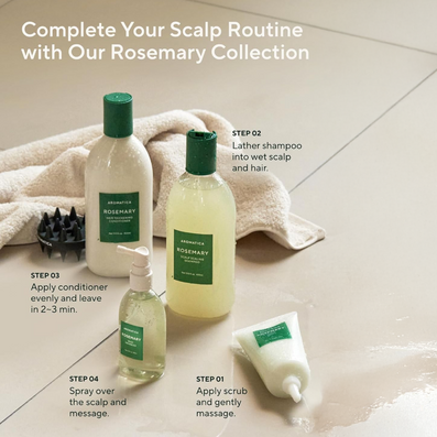 Aromatica Rosemary Root Enhancer (100ml) is a refreshing, Korean scalp tonic designed to purify the scalp, remove excess oil and product build-up, soothe flakiness, and promote healthy hair growth.