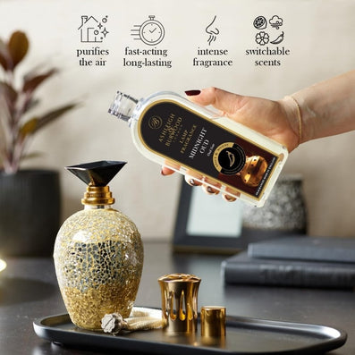 Ashleigh & Burwood Lamp Fragrance Midnight Oud (500ml) is a powerful fragrance containing natural extracts which add subtle freshness and enhanced ambience to your home, instilling a sensation of well-being. Rich and woody, the seductive scent of oud is infused with zesty Citrus while notes of Patchouli, Vanilla and Musk give underlying elements of warmth to this exquisite fragrance. Midnight Oud is a lasting fragrance that brings an element of mystery into the home. Cruelty-free & vegan-friendly.
