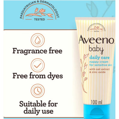Aveeno Baby Daily Care Nappy Cream (100ml) soothes sensitive and delicate baby skin, protecting it from the causes of nappy rash. Formulated with Oatmeal Extract and Zinc Oxide, this cream is suitable for new-borns and those who may be prone to eczema.