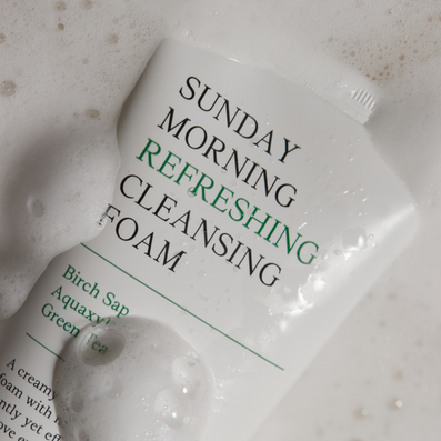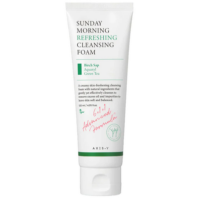 Axis-Y 6+1+1 Sunday Morning Refreshing Cleansing Foam (120ml) cleanses without stripping the skin of its essential oils, maintaining moisture with a pH of 5.5. Enhanced with double Birch Sap, Perilla Leaf Extract, Rice Bran, and Heartleaf, this foam leaves skin hydrated and radiant.