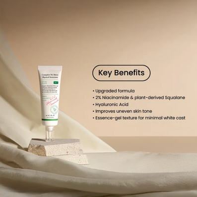 Axis-Y 6+1+1 Complete No-Stress Physical Sunscreen PA++++ SPF50+ (50ml) combines robust UVA/UVB protection with the healing touch of nature's finest ingredients. This essence-gel texture is enriched with Hyaluronic Acid, ensuring hydration without the heavy scent.