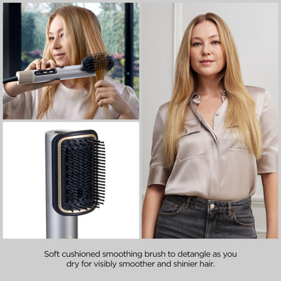 Featuring multiple interchangeable attachments, the Air Wand effortlessly transitions between drying, detangling, volumising and smoothing to create your desired finish. The curved oval brush adds body and lift, while the ceramic fins gently detangle and smooth curls and coils, leaving hair soft and polished. The soft air-cushioned brush with flexible, ball-tipped bristles ensures gentle detangling without tugging, giving a shiny, frizz-free finish. Its high-speed digital motor, ultra-care heat regulation mode and anti-frizz dual ionic system ensure powerful yet protective styling suited to all hair types.