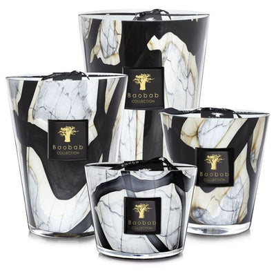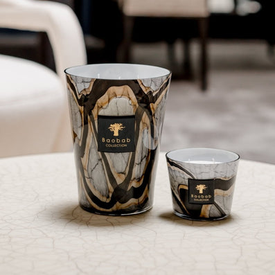 Baobab Collection Max 24 Stones Marble Candle will make an impressive addition to your home decor with its hand-blown glass replicating grey marble, decorated with black strokes edged with beige. The elegance of the glass reveals the flame, creating the effect of a luminous stone. The fragrance enigmatically blends Leather, Rose and Plum to perfectly embody the dual characteristics of Marble Stones, both feminine and masculine.