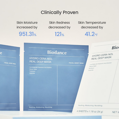 Biodance Hydro Cera-Nol Real Deep Mask (34g) is a soothing, moisturising, nourishing mask which has been formulated for use on sensitive, irritated skin. Biodance's patented Hydro Cera-Nol ingredient effectively soothes the skin and strengthens its natural protective barrier. 50,000ppm of high-purity, mineral-rich glacial water improves the absorption of the formula's key active ingredients and forms a moisturising film on the skin. D-Panthenol calms and moisturises the skin, reducing inflammation. 5-Layer Ceramide minimises water loss whilst Oligo Hyaluronic Acid effectively hydrates the deeper layers of the skin.