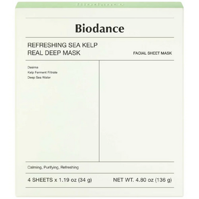 Biodance Refreshing Sea Kelp Real Deep Mask (4 x 34g) is a soothing hydro-gel facial mask designed to calm irritation, purify the skin and refine texture, making it especially suited to oily and acne-prone complexions.