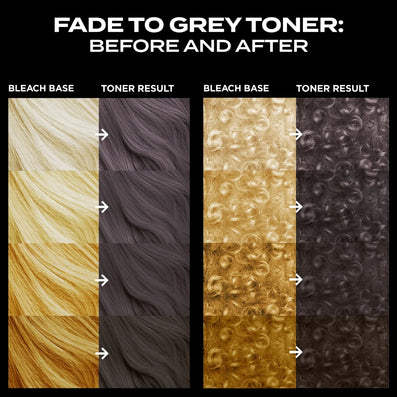 Bleach London Fade To Grey Charcoal Grey Toner Kit is a Charcoal Grey-coloured, semi-permanent toner which deposits a strong steely grey tone into bleached strands to neutralise brassy yellows and create a cool, slatey finish or base for dark ashy colours. This gentle, ammonia-free toner works best on pale yellow bleached blonde hair of any type.