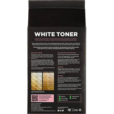 Bleach London White Toner Kit Is an ashy semi-permanent toner which deposits semi-permanent blue-based colour onto bleached strands to neutralise brassy yellow tones, leaving a pristine icy blonde finish or perfect first layer for cool, sharp colour on top. This gentle, ammonia-free White Toner works best on pale yellow bleached blonde hair. If your bleached hair is darker, you'll probably end up with an ashy blonde.