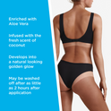 Formulated with 8% DHA as its key active ingredient, this solution has been enriched with Aloe Vera and infused with the fresh scent of Coconut for a long-lasting tan that hydrates and nourishes the skin. This tan solution is touch dry in seconds and may be washed off 2 hours after application. Cruelty-free & vegan-friendly.