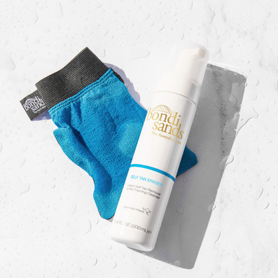 - For dry skin or stubborn areas, use Bondi Sands Exfoliating Mitt to lightly remove excess.