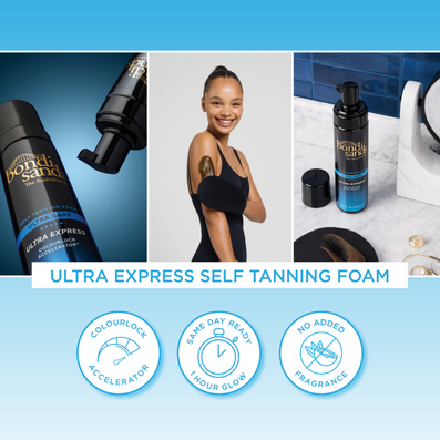Demonstrating why they are the UK’s Number One Self Tan Brand, Bondi Sands' Ultra Express Self Tanning Foam is unlike anything else in the market. This dual-action formula features world-first ColourLock Accelerator™ technology, working to lock in your tan while creating a protective barrier on the skin to enhance water resistance and extend colour longevity. Lightweight and fragrance-free, this hydrating tanning foam is suitable for all skin types and ideal for those needing a rapid, same-day-ready tan. Ultra Express requires two coats to achieve the deepest express glow, providing long-lasting, natural-looking results. Cruelty-free & vegan-friendly.