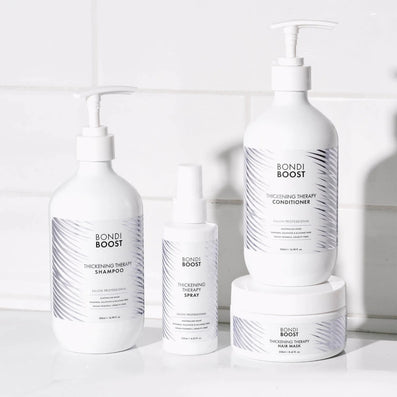 BondiBoost Thickening Therapy Conditioner (500ml) is a volumising conditioner for use on fine, flat and limp hair to create the illusion of fuller-looking lengths. Formulated with a blend of natural and organic ingredients, this conditioner effectively plumps and thickens the appearance of strands, delivering a full-bodied finish.
