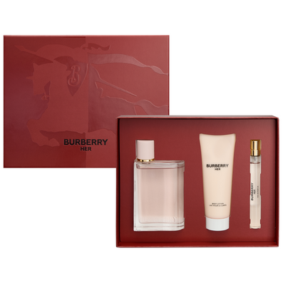 Burberry Her Eau De Parfum Gift Set (100ml) is an attractively presented 3-piece fragrance gift set for women comprising large and travel size versions of the eau de parfum together with a matching fragranced body lotion.
