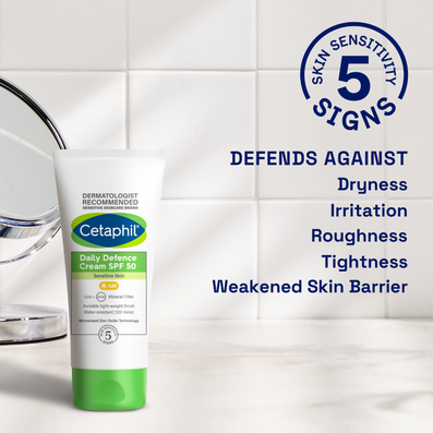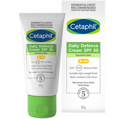 Cetaphil Daily Defence Cream SPF50+ (50g) is a lightweight, easily absorbed, water-resistant facial day cream which hydrates the skin and provides high broad-spectrum UVA and UVB protection to help defend against the effects of daily exposure to sunlight.