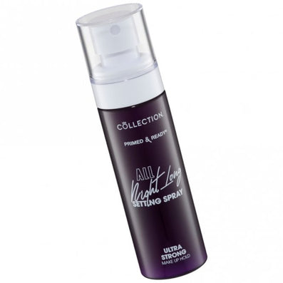 Collection Cosmetics Primed & Ready All Night Long Ultra Strong Hold Setting Spray (70ml) ensures that makeup stays fresh all day and night, providing up to 24 hours of wear.