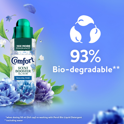 Enriched with essential oils, its bead-infused, transparent formula works effectively even in short and cold cycles. Experience the long-lasting scent of vibrant Patchouli, soothing Violet, and refreshing Eucalyptus, keeping your clothes fresh for longer. Comfort scent boosters are 93% biodegradable (excluding water) and suitable for various fabrics. For the ultimate fragrance experience, pair with Comfort Heavenly Fresh Fabric Conditioner for a multi-sensory burst of freshness. Cruelty-free.