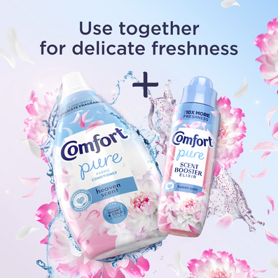 Comfort Pure Heaven Scent Booster Elixir (20 Washes, 460ml) delivers a delicate yet divine fragrance boost, leaving your laundry beautifully soft and gently perfumed. Dermatologist recommended by the Skin Health Alliance, it's gentle enough for the whole family, providing skin-kind care alongside a heavenly burst of long-lasting freshness.