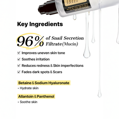 CosRx Advanced Snail96 Mucin Power Firming Essence (100ml) is a dermatologist-tested, hypoallergenic, lightweight essence formulated with 96.3% Snail Mucin to refresh, hydrate and plump the skin without feeling heavy.