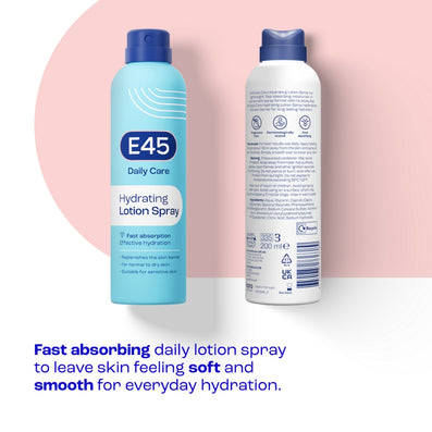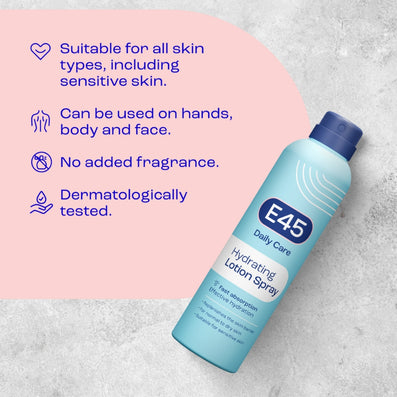E45 Daily Lotion Spray (200ml) offers quick, effective hydration with a formula designed for fast absorption, leaving skin soft and hydrated without a heavy feel. This light, easy-to-apply spray is perfect for daily use on dry and sensitive skin.