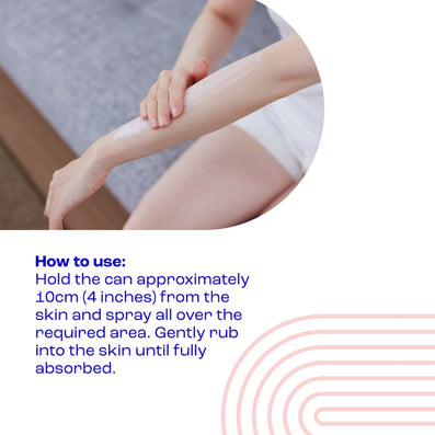 - Hold the can approximately 10cm from the skin and spray all over the desired area.