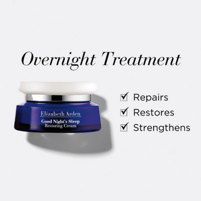 Elizabeth Arden Good Night's Sleep Restoring Cream (50ml) is a nourishing night cream designed to help restore and hydrate the skin while you sleep. The rich, comforting formula works overnight to support the skin's natural renewal process, helping the complexion look refreshed, smooth and more radiant by morning.