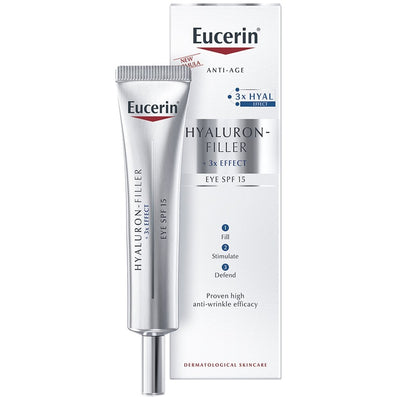 Eucerin Anti Age Hyaluron Filler Eye Cream SPF15 (15ml) is an anti-ageing, firming eye cream for all skin types with UVA and UVB protection which plumps up deep wrinkles and firms the skin around the eyes for a lifting effect. The eye cream combines three active ingredients which target the specific layers of the skin where volume loss occurs.