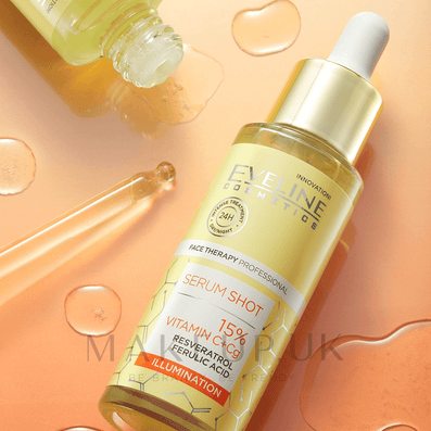Eveline Cosmetics Face Therapy Professional Vitamin C Serum Shot (30ml) is a concentrated serum, formulated for use on the face to brighten and illuminate dull complexions to create a more even, refined skin tone.