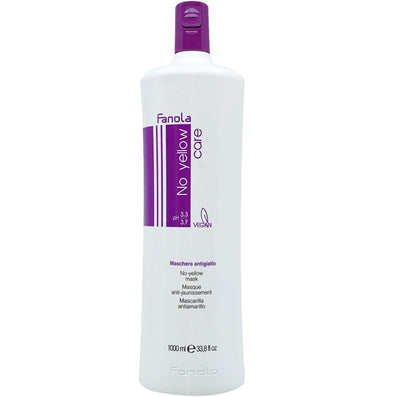 - 1 x Fanola No Yellow Mask (1000ml) - has been formulated for use on bleached, highlighted, blonde or grey hair. Formulated with strong violet pigments, it effectively tones down unwanted yellow, brassy tones with long-lasting effect. Sealing the cuticle with its acidic pH, it creates a protective violet film which combats yellow reflections. Its conditioning action leaves the hair with a smooth, satin finish. Completely cruelty-free.
