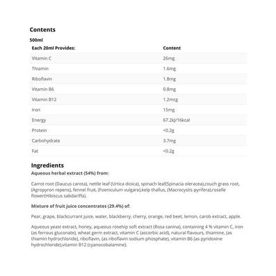 Floradix contributes to normal red blood cell and haemoglobin formation, ensuring your body's cells receive all the oxygen needed for their respiration and function. This works in conjunction with vitamins B2, B6, B12 and C, contributing to a normal energy-yielding metabolism, healthy skin and increased Iron (II) uptake.