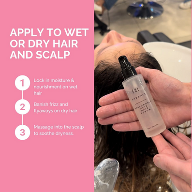 - Dry Styling - apply a pea-sized amount of FUL Hyaluronic Acid Hair Serum and work through to your mid-lengths and ends to help hydrate and tame flyaways, then style as usual. Alternatively, use as a spot treatment for a dry scalp and to tame frizz and flyaways once your hair is styled.