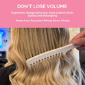 With built-in antistatic technology, it creates a sleek, frizz-free finish for a polished look. The ergonomic design offers superior control for comfortable styling, while its easy-to-clean construction ensures scalp-friendly care, especially for those with dry or flaky skin. Made from a sustainable blend of recycled wheat straw plastic and polypropylene. Cruelty-free & vegan-friendly.
