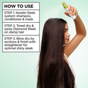 - After completing the Keratin Sleek shampoo, conditioner or mask routine, towel-dry hair.