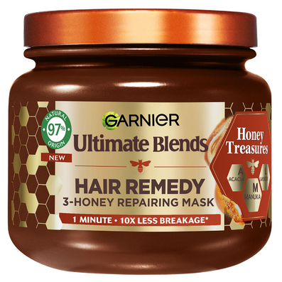 Garnier Ultimate Blends Honey Treasures Hair Remedy 3-Honey Repairing Hair Mask (340ml) is a luxurious treatment designed for damaged and fragile hair. Powered by three potent types of honey, Acacia, Lavender and precious Manuka, this mask creates the new AML complex, renowned for its repairing, strengthening, and nourishing properties. It targets the three signs of visible hair damage, reducing split ends by half and delivering up to ten times less breakage in just one minute.