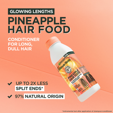 Garnier Ultimate Blends Pineapple Hair Food Glowing Lengths Conditioner (350ml) is specially designed for long, dull hair, transforming it into radiant, silky strands. Enriched with Pineapple and Amla, this conditioner nourishes and softens hair without weighing it down, leaving lengths intensely shiny and glowing.