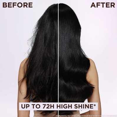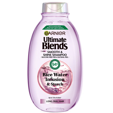 - 1 x Garnier Ultimate Blends Rice Water Smooth & Shine Shampoo (300ml) - specially formulated for long, dull hair, providing intense care and hydration. As hair grows, it is constantly exposed to environmental stressors that can damage the fibre, leaving the cuticle open and hair looking dull and rough. Enriched with Rice Water and Starch, this shampoo helps retain and lock in moisture for instantly replumped hair. The formula smooths the hair fibre, sealing cuticles to enhance light reflection, resulting in smooth, shiny hair for up to 72 hours. Its gelled texture, made with 94% natural-origin ingredients, creates a luscious lather that coats the hair and rinses off easily, leaving hair soft, silky, and manageable. The plant-derived cleansing base ensures gentle care while promoting healthy, radiant hair. Free from silicone and artificial ingredients. Cruelty-free & vegan-friendly.