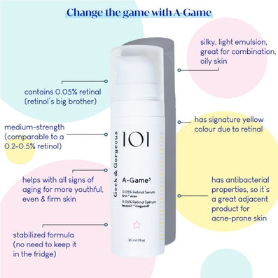 Geek & Gorgeous 101 A-Game 5 0.05% Retinal Serum (30ml) is a silky, light emulsion serum formulated with a high-strength amount of Retinal to help combat the classic signs of skin ageing. Suitable for use on all skin types, especially combination and oily skin, this serum addresses a range of skin concerns including wrinkles, loss of firmness and pigmentation.