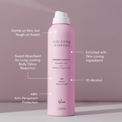 Gem Skin Loving Deodorant Spray Coconut Vanilla (200ml) is a gentle yet effective deodorant designed to keep you feeling fresh, dry, and confident for up to 48 hours.