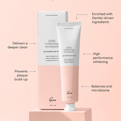 Gem Triple Whitening Toothpaste Watermelon Mint (100g) is a high-performance whitening toothpaste designed to brighten, protect and refresh without compromising your enamel. This better-for-you formula combines dentist-backed science with innovative, gentle ingredients to deliver visibly whiter teeth, fresher breath and a deep clean that lasts.
