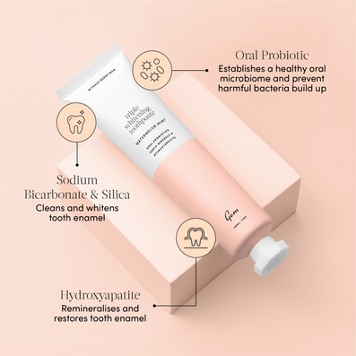 Sodium Bicarbonate and Silica effectively polish and whiten, while an oral probiotic helps support a healthy mouth microbiome. Hydroxyapatite, a natural alternative to fluoride derived from Coconut, works to remineralise enamel and reduce discolouration, helping to strengthen and protect teeth over time. With a luxurious foaming texture and a juicy, refreshing Watermelon Mint flavour, this toothpaste transforms your daily routine into a more effective and enjoyable experience. Free from paraben, alcohol and sulphate. Cruelty-free & vegan-friendly.