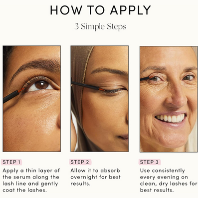 - Apply a thin layer of serum along the lash line and gently coat the lashes.