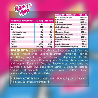 Grenade High Caffeine Zero Sugar Pre-Workout Powder Berried Alive (330g) is a zero-sugar, naturally high-caffeine pre-workout drink with a delightful Strawberry and Blueberry flavour.
