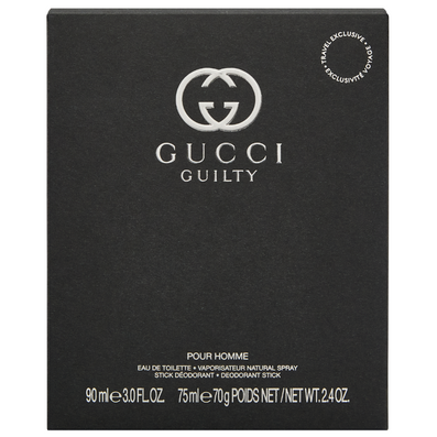 Gucci Guilty For Him Eau De Toilette Gift Set (90ml) is a beautifully presented fragrance gift set containing Gucci Guilty in a full-sized 90ml bottle, alongside a 75ml deodorant stick.